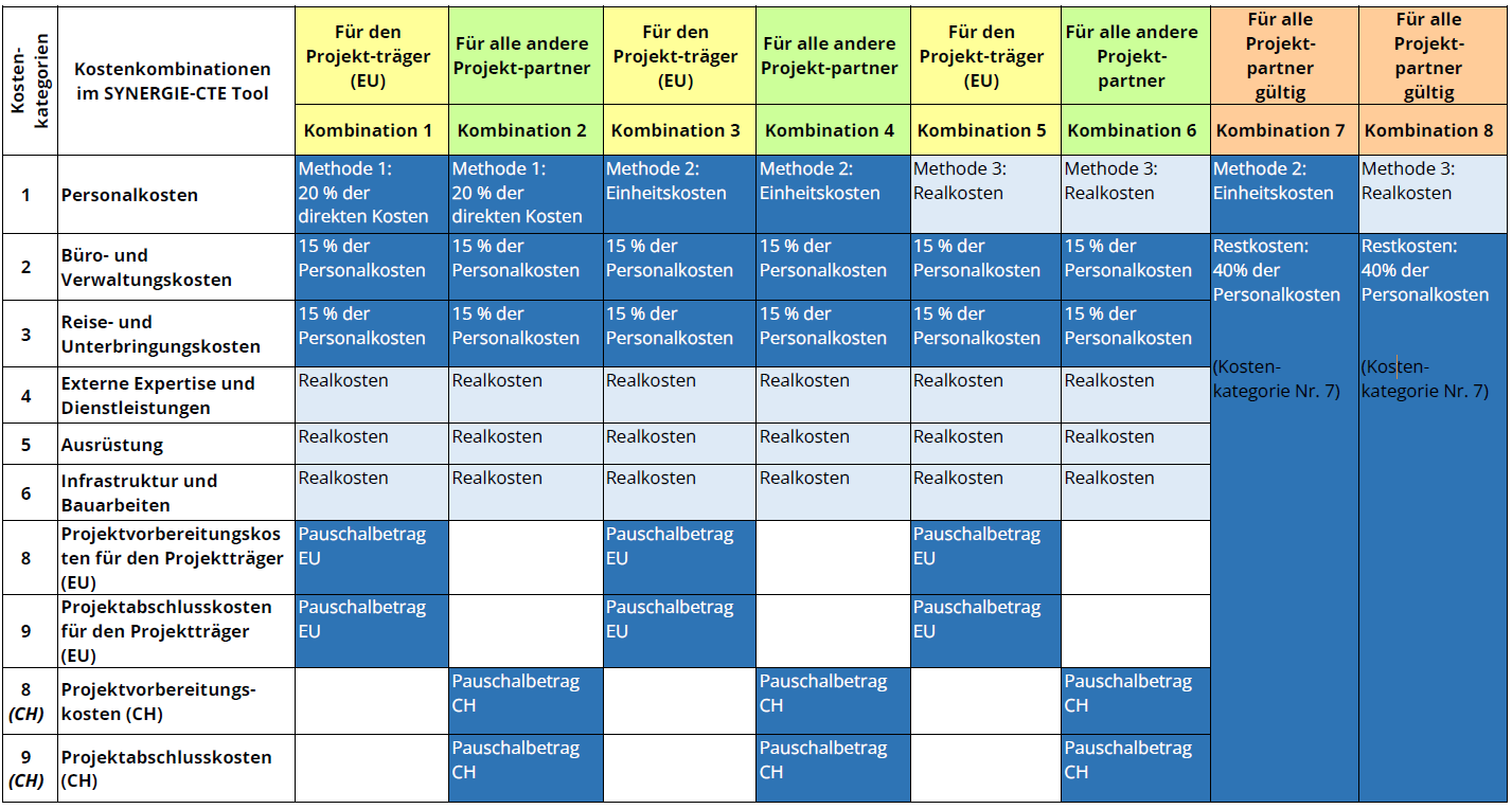 Bei der Erstellung des Kostenplans für Ihr Projekt hat Ihre Einrichtung eine der fünf möglichen Kombinationen (s. u.) ausgewählt, um von bestimmten vereinfachten Kosten zu profitieren.